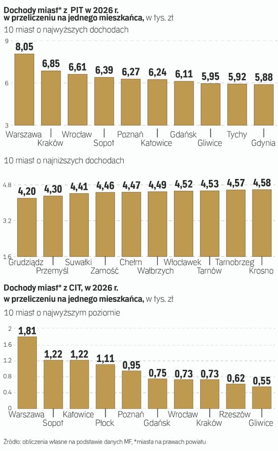 W ujęciu nominalnym największe kwoty trafią oczywiście do największych miast. Warszawa ma otrzymać z tytułu udziału w PIT aż ok. 15 mld zł, Kraków – 5,5 mld zł, Wrocław – 4,5 mld zł, Łódź – 3,7 mld zł, a Poznań – ok. 3,4 mld zł.