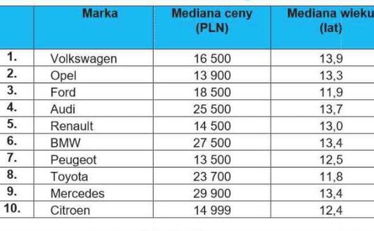 TOP 10 najczęściej sprzedawanych marek aut na rynku wtórnym w 2021 roku, wraz z medianą ceny i roku produkcji:
