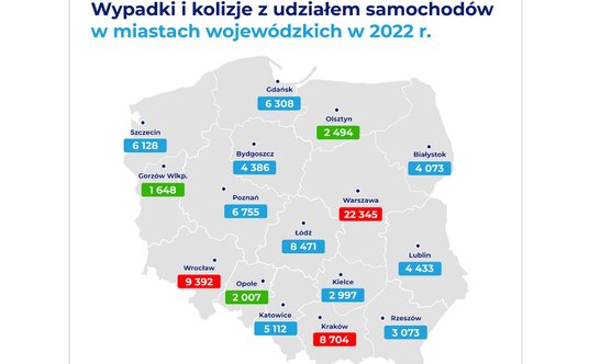 Wśród miast wojewódzkich najczęściej do wypadków i kolizji drogowych z udziałem samochodów osobowych w przeliczeniu na 1000 mieszkańców dochodzi w Katowicach (18,1). W ścisłej czołówce znajdują się również Kielce (16,2) i Opole (15,8). Co ciekawe, w przeliczeniu na 1000 mieszkańców najrzadziej do wypadków i kolizji dochodzi w Krakowie (10,8) i w Warszawie (12). Natomiast na najniższym stopniu podium znajduje się Poznań (12,4). Jednocześnie warto podkreślić, że w całej Polsce w 2022 r. liczba wypadków i kolizji z udziałem samochodów osobowych zmniejszyła się z 407 295 do 351 154 w porównaniu do 2021 r. Oznacza to spadek o 56 141. Mniejszą liczbę zdarzeń drogowych odnotowano we wszystkich szesnastu województwach. Najbardziej w mazowieckim (-8935 rok do roku), śląskim (-6185) i dolnośląskim (-5127).