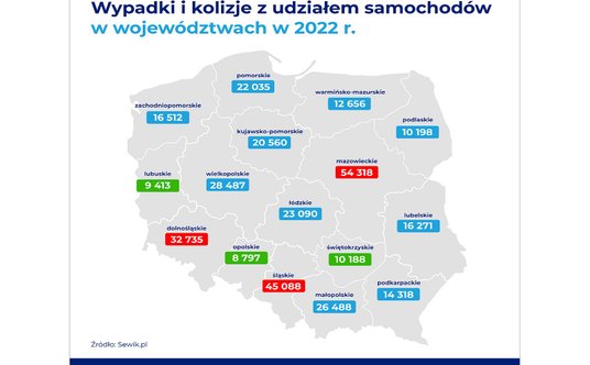 Najczęstszą przyczyną zdarzeń jest zbyt duża prędkość i niezachowanie bezpiecznej odległości między pojazdami. Eksperci porównywarki rankomat.pl przeanalizowali dane zawarte w bazie Systemu Ewidencji Wypadków i Kolizji (SEWiK) i na ich podstawie ustalili, gdzie w Polsce najczęściej dochodzi do wypadków oraz kolizji drogowych z udziałem samochodów osobowych. W 2022 r. w Polsce do największej liczby wypadków i kolizji z udziałem samochodów osobowych doszło w województwie mazowieckim (54 318). W czołówce znalazły się również śląskie (45 088) i dolnośląskie (32 735). Z kolei najmniej zdarzeń drogowych odnotowano w opolskim (8797), lubuskim (9413) i świętokrzyskim (10 188).