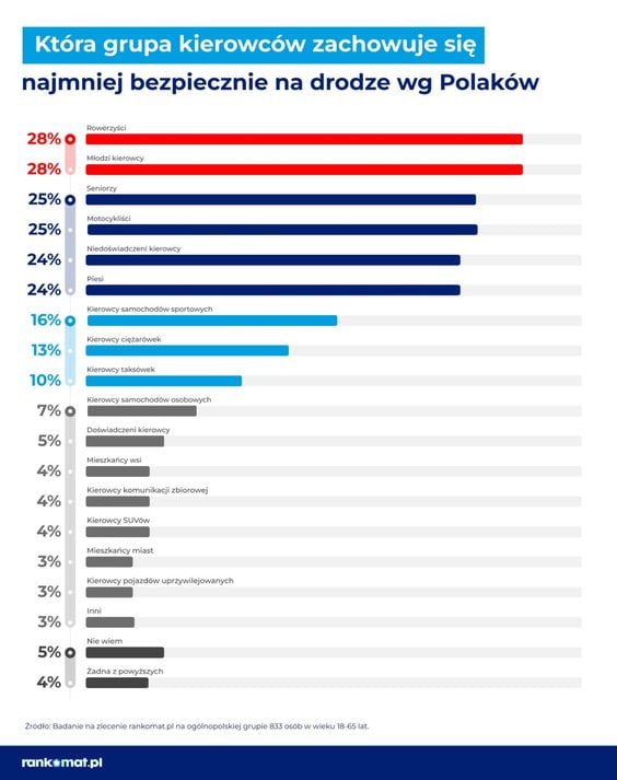 Według ankiety 28 proc. badanych za najbardziej ryzykownych uznaje młodych kierowców oraz rowerzystów. Niewiele mniej wskazań otrzymali seniorzy i motocykliści (po 25 proc.). Na podium znaleźli się także piesi i niedoświadczeni kierowcy (24 proc.). Najmniej obaw budzą kierujący pojazdami uprzywilejowanymi oraz mieszkańcy dużych miast - po 3 proc. wskazań. Statystyki potwierdzają społeczne odczucia. Kierowcy w wieku 18-24 lata wciąż notują najwyższy wskaźnik wypadków - 11,79 na 10 tys. populacji. Z kolei użytkownicy jednośladów (rowerzyści, motocykliści i motorowerzyści) odpowiadają za blisko 14 proc. wszystkich zdarzeń.