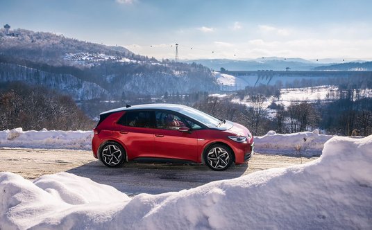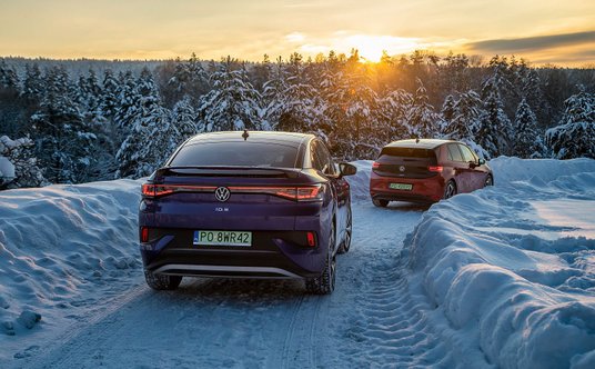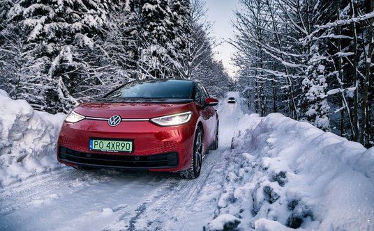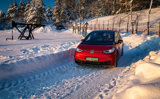 By sprawdzić, jakie jest rzeczywiste zużycie prądu w elektrykach, zostaliśmy wyposażeni w trzy modele VW – ID.3, ID.4 i ID.5. Pierwszy z nich dysponuje akumulatorem o pojemności 55 kWh netto, zaś kompaktowe SUV-y 77 kWh. Zaczynamy od mniejszego auta. ID.3 wprowadził Volkswagena w nową erę. Jest alternatywą dla Golfa i posłużył technologią Cuprze Born. Ma 204 KM, przyspiesza do setki w 7,3 sekundy i rozpędza się do 160 km/h. Według producenta, maksymalny zasięg nieznacznie przekracza 400 kilometrów (WLTP). Z uwagi na dość nisko umieszczony środek ciężkości, na suchej nawierzchni prowadzi się nad wyraz dobrze. Moment obrotowy trafia na koła tylnej osi, a korzystny rozkład masy sprawia, że trudno niemiecki kompakt wyprowadzić z równowagi. Prowadzenie spodoba się największym sceptykom elektromobilności. Może i mamy tutaj nieco za mocno wspomagany układ kierowniczy, ale jazda w zakrętach potrafi dać dużo frajdy. Nie mamy też zastrzeżeń do autostradowych podróży, choć przy temperaturze nieznacznie przekraczającej zero stopni Celsjusza, wartości przekazywane przez komputer pokłady nie napawają optymizmem – 28-32 kWh przy 140 km/h. Wystarczy jednak zwolnić do 120, by zejść do 23-24 kWh.
