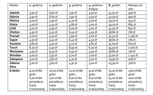 – Strefa nie jest po to, aby na niej zarabiać, ale po to, by zapewnić rotację miejsc postojowych. Uważamy, że tam, gdzie nie ma problemu z ich znalezieniem opłaty powinno się obniżać, a tam, gdzie brakuje wolnych miejsc – podwyższać – przekonywał podczas lutowego posiedzenia Rady Miasta Michał Starobrat, szef klubu Nowoczesny Kraków, cytowany przez Polskapress. Nowe stawki przedstawił niedawno Kraków. Pierwsza godzina parkowania dla mieszkańców miasta, którzy posiadają Kartę Krakowską i korzystają z aplikacji mobilnej w podstrefie A, nie ulegnie zmianie – będzie to 6 zł, a w podstrefie B – 5 zł, w podstrefie C – 4 zł. Druga godzina to koszt odpowiednio: 7, 6, i 4 zł. Trzecia godzina postoju to 8, 7 i 4 zł, a czwarta i kolejne to 6, 5 i 4 zł. Kto nie korzysta z aplikacji, zapłaci tyle co turysta, czyli 9 zł za pierwszą godzinę w strefie A, 8 zł w podstrefie B i 7 zł w C, a w kolejnych godzinach będzie jeszcze drożej – nawet 11 zł za trzecią godzinę.