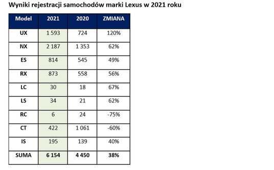 Największy wzrost osiągnęło flagowe coupe LC (+53 proc.), do czego przyczynił się debiut modelu LC Convertible. Flagowy Lexus LS również znacznie zwiększył sprzedaż (+46 proc.) po odświeżeniu modelu na początku 2021 roku. Lexus UX zanotował rekordowy wzrost o 25 proc., głównie dzięki nowej elektrycznej wersji tego modelu. Zainteresowanie europejskich klientów sedanem ES zwiększyło się o 19 proc. Najpopularniejszymi modelami Lexusa w Europie są kompaktowy crossover UX, który osiągnął sprzedaż 21 144 samochodów, średniej wielkości SUV NX, który trafił do 19 493 kierowców, oraz duży SUV RX z wynikiem 18 346 aut. Gama SUV-ów odpowiadała w minionym roku za 87 proc. sprzedaży Lexusa w Europie. Modele hybrydowe to nie mniej niż 96 proc. sprzedaży Lexusa w Europie Zachodniej. Od momentu wprowadzenia pierwszego hybrydowego Lexusa RX400h w 2005 roku po drogach Europy jeździ ponad pół miliona hybryd marki Lexus. Najpopularniejszy model hybrydowy, Lexus UX, zanotował sprzedaż 17 261 egzemplarzy w ciągu roku. Drugim najchętniej wybieranym hybrydowym Lexusem był NX z wynikiem 14 255 samochodów, zaś trzecim – RX z wynikiem 5 718 aut. Elektryczny UX 300e trafił do 2 987 kierowców.