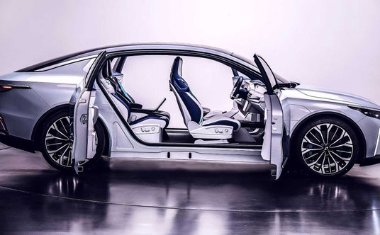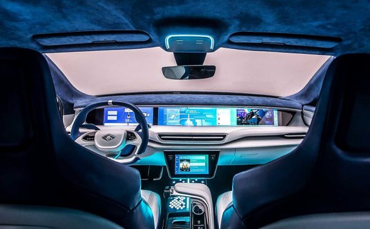 Wnętrze elektrycznego sedana ma oczywiście duże wyświetlacze na desce rozdzielczej, a kamery zastępują konwencjonalne lusterka zewnętrzne. Czterech pasażerów zajmuje miejsca na pojedynczych, obitych skórą siedzeniach. Pasażerowie z tyłu mają własny ekran dotykowy pomiędzy siedzeniami.