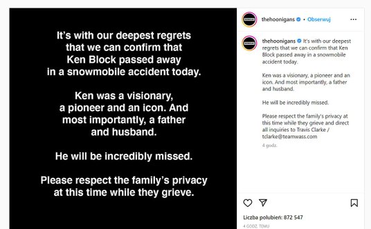 Tragiczne wieści zostały potwierdzone przez Hoonigan Racing Division, czyli zespół założony przez Blocka: "Z głębokim żalem możemy potwierdzamy fakt, że Ken Block zginął dzisiaj w wypadku na skuterze śnieżnym. Ken był wizjonerem, pionierem i ikoną. A przede wszystkim ojcem i mężem. Będzie go bardzo brakowało. Prosimy o uszanowanie prywatności rodziny pogrążonej teraz w żałobie." - głosi komunikat zespołu. Ken Block pozostawił żonę i troje dzieci.