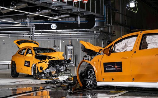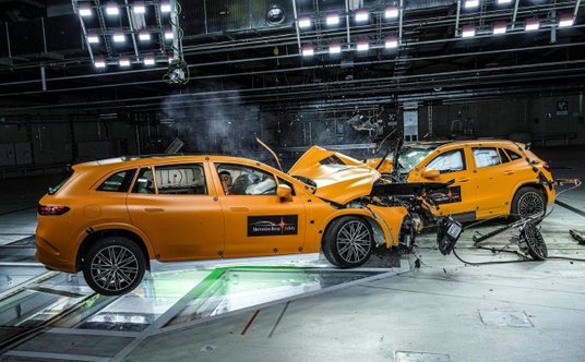 W centrum zderzeniowym codziennie przeprowadzane są trzy crash testy, 900 przez cały rok. Ale dwa elektryczne Mercedesy zderzą się tu po raz pierwszy. Eksperci ds. bezpieczeństwa chcą sprawdzić jakie powstaną odkształcenia i związane z nim rozpraszanie energii. Samochody przeszły kolizję w warunkach trudniejszych niż wymagane przez prawo. Euro NCAP określa prędkość przy tego typu testach na 50 km/h. Pomimo poważnych deformacji Paul Dick jest bardzo zadowolony. Kabina pasażerska i akumulator wysokiego napięcia pozostały nienaruszone, drzwi w obu pojazdach można było otworzyć, a układy wysokiego napięcia wyłączyły się automatycznie. Jednak w EQA przód i przednia szyba zostały znacznie bardziej dotknięte niż w EQS SUV. Wewnątrz mniejszego znajdują się drobne kawałki szkła. Dla inżynierów testujących ważne jest, aby z przedniej szyby nie odpadły żadne duże kawałki szkła.
