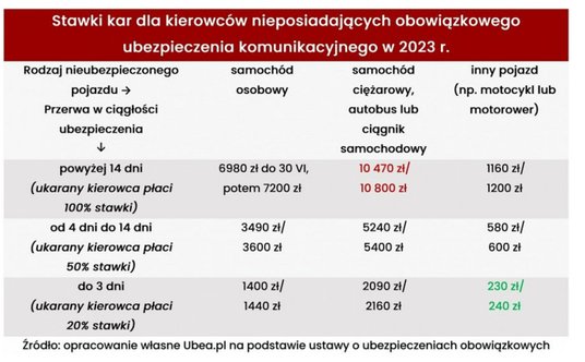 W 2023 r. nadal będzie funkcjonował mechanizm uzależniający poziom kary za brak OC od minimalnego wynagrodzenia. Przykładowo, ustawa z dnia 22 maja 2003 r. o ubezpieczeniach obowiązkowych, Ubezpieczeniowym Funduszu Gwarancyjnym i Polskim Biurze Ubezpieczycieli Komunikacyjnych wskazuje, że posiadacz auta za przerwę w ochronie trwającą ponad 14 dni musi zapłacić równowartość 200% minimalnego wynagrodzenia. „Jak nietrudno obliczyć, taka podstawowa kara za brak OC wzrośnie 1 stycznia 2023 r. z 6020 zł do 6980 zł. Na początku lipca 2023 r. czeka nas kolejny wzrost opisywanej kary; tym razem do 7200 zł” - wylicza Andrzej Prajsnar, ekspert porównywarki ubezpieczeniowej Ubea.pl.