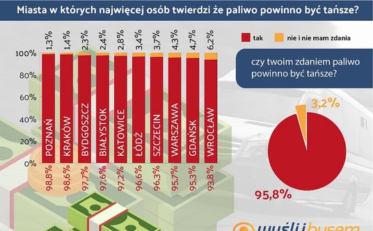 Analitycy z giełdy transportowej wyslijbusem.pl przeprowadzili (w okresie 2 i 3 kwartału tego roku) badanie ankietowe (próba 1381 respondentów w 10 największych miastach Polski), dotyczące zużycia i wykorzystania paliwa przez mieszkańców największych miast w Polsce. Wśród zagadnień, które były badane wymienić można m.in.: ile pieniędzy Polacy wydają na paliwo, jak często tankują czy w których miastach kierowcy pokonują najdłuższe dystanse. Jak się okazało, Polacy starają się oszczędzać na paliwie. Ponad 54 proc. tankuje za kwotę poniżej 500 zł miesięcznie. Natomiast wydatki na paliwo powyżej 1000 zł miesięcznie deklaruje tylko 16,2 proc. ankietowanych. Najmniej na paliwo wydają mieszkańcy Katowic (blisko 63 proc.). We Wrocławiu nieco ponad 60 proc. ankietowanych odpowiedziało, że miesięcznie nie przeznacza na paliwo więcej niż 500 zł. W pierwszej trójce pojawiają się również mieszkańcy Łodzi osiągając ponad 2 punkty procentowe mniej od stolicy Dolnego Śląska. Natomiast ankietowani ze Szczecina dominują w grupie wydających powyżej 1000 zł miesięcznie na paliwo. Mieszkańcy stolicy należą do grupy osób, które w porównaniu do innych miast wojewódzkich, przeznaczają równie dużą kwotę na paliwo w skali miesiąca.