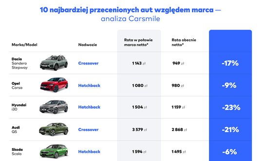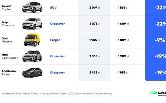 W zestawieniu opracowanym przez Carsmile znalazły się auta z różnych segmentów cenowych i o różnych typach nadwozia. Uwaga! Zestawienie to ma charakter poglądowy, sytuacja na rynku jest bowiem wciąż bardzo dynamiczna i ceny samochodów mogą ulegać bardzo dużym zmianom. Średnia obniżka raty aut ujętych w zestawieniu wyniosła względem połowy marca 16 proc., a mediana – 18 proc. Na uwagę zasługują przede wszystkim trzy crossovery, w przypadku których miesięczny abonament netto jest nawet o 700 zł tańszy niż jeszcze kilkanaście tygodni temu. Są to: Audi Q5, Jeep Compass, Alfa Romeo Tonale oraz Mini Countryman.