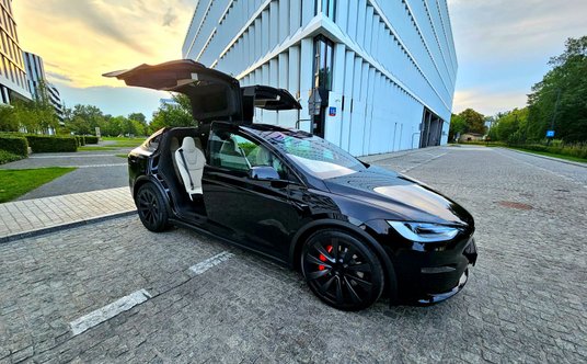 Wygląda całkiem nieźle. Czarne duże koła, taki sam kolor nadwozia, zgrabna sylwetka, nieco dziwnie – jedna za drugą – umiejscowione klamki, mocno ścięty tył karoserii. Ma nieco ponad pięć metrów długości, ponad dwa szerokości i 168 cm wysokości. To duże auto pokroju Audi Q7. Nie ma dużych spoilerów, płatów dociskających, wysuwanych skrzydeł i jakichkolwiek aerodynamicznych bajerów. Jedynym takim elementem jest niewielki, zamontowany na stałe spoiler na tylnej klapie bagażnika. A dlaczego w takim aucie powinny być spoilery? Bo ma ponad 1000 KM mocy i większość producentów już przy połowie tej mocy popada w szał aerodynamicznych dodatków. Tak, czarna Tesla Model X to ta słynna wersja Plaid, która może uchodzić za najlepszego sleepera w mieście. Widząc ten samochód, nikt nie pomyśli o tym, że może mieć aż taką moc. I to jest pierwsza fajna rzecz w tej Tesli.